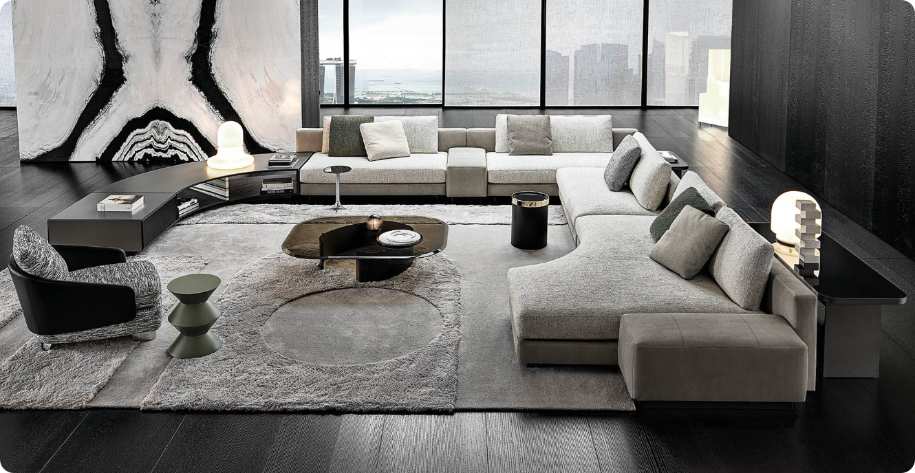 一款风格优雅大气的设计款沙发,规则的曲线和椭圆打断了线性布局,给空间注入了更动态的动量。靠背不同宽度的组合产生了一种靠背似乎重叠的效果,当沙发设置在房间中央时,消除了沙发作为屏障的感觉,还可以容纳脚凳等小尺寸模块,创造不同组合,适用于宽敞的客厅空间。