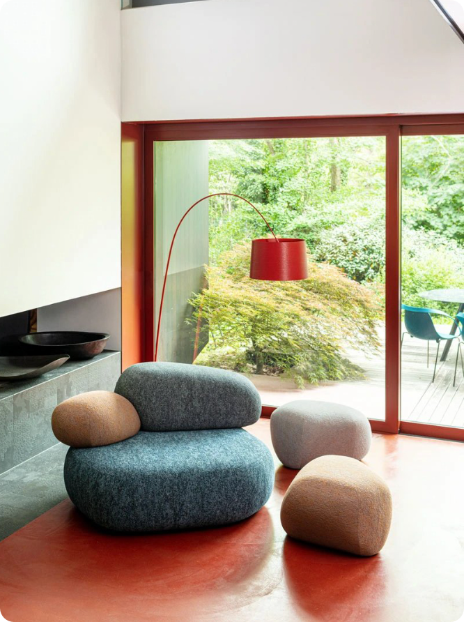 鹅卵石沙发的设计灵感多源自自然,如圆润的鹅卵石、树木、岩石、苔藓等自然元素,通过设计将这些元素融入家具中,为家居空间增添自然与舒适的氛围。